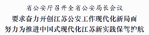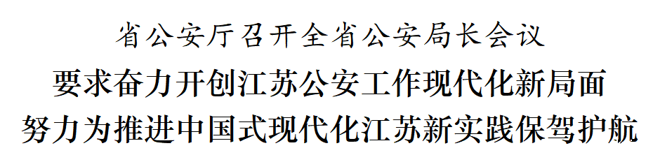 会议对做好2024年全省公安工作进行了部署,强调要全面聚力全省公安工作现代化的主攻战场,推动更高水平平安江苏建设,重点聚焦政治安全、网络安全、维护稳定、打击犯罪、安全监管、服务发展“六大战场”,打好主动仗、掌握主动权,切实以新安全格局保障新发展格局,以高水平安全保障高质量发展。