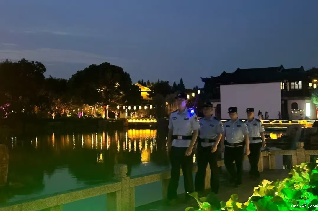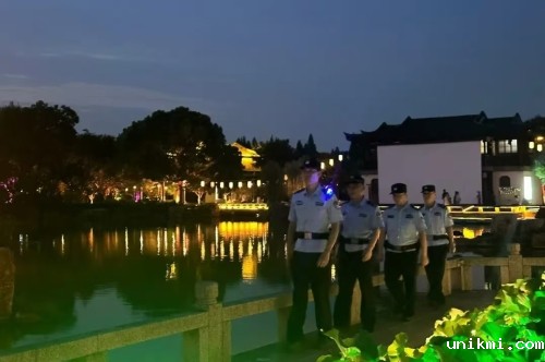 图为8月9日晚,常熟市公安局虞山尚湖度假区派出所警力至辖区景点内重点水域附近开展巡逻。
