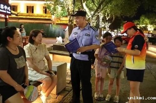 图为8月10日晚,常州市公安局钟楼分局组织见义勇为志愿者和北大街派出所同心圆服务队民警宣传反诈知识,宣扬见义勇为精神。